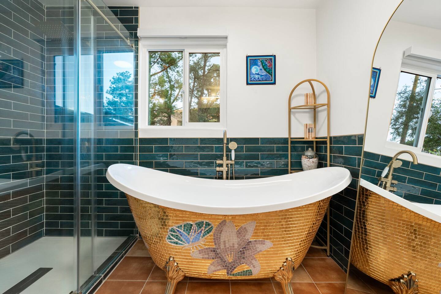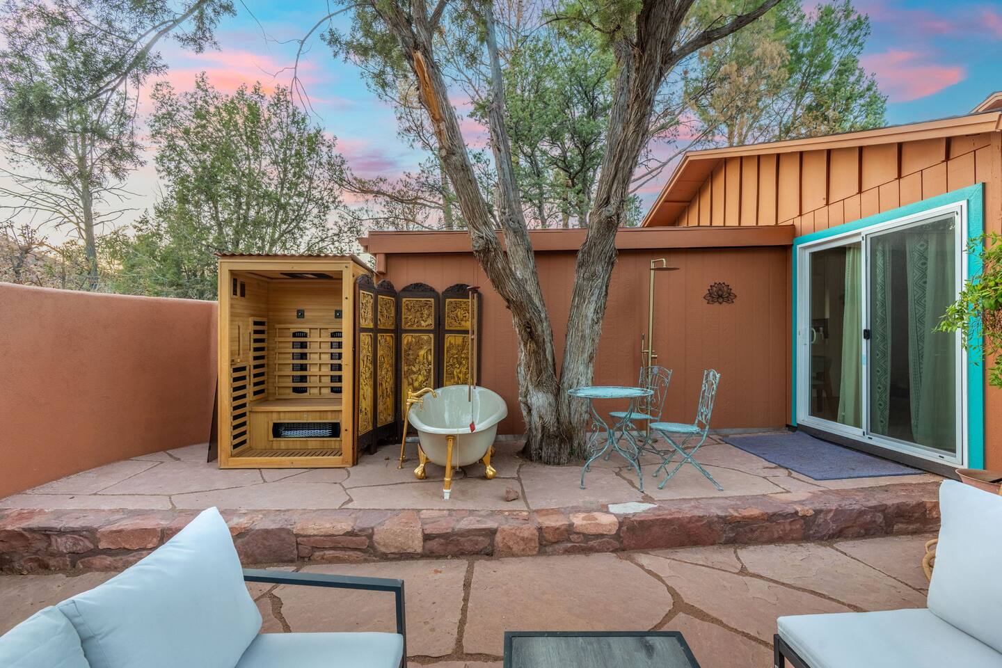 This is a 4-bedroom, 3 bathroom home with three luxurious Birch and Avocado Organic King and wool/latex hybrid mattresses (the same ones we use at home :) and your choice of 2 twin beds or a split king in the fourth bedroom. There are two attached but separate spaces for larger groups where a couple or family wants some privacy from the main space: Studio: Studio with king bed, private outdoor sauna, outdoor shower clawfoot soaking tub with view of cathedral rock, fire pit, grill, dining area, well-equipped full kitchen, and a bathroom with walk-in shower. I like staying in the studio when I visit :) Main House: 3 Bedrooms + 2 bathrooms, two king beds plus a 2x twin/split king depending on if you're traveling with kids or couples. The living room has an epic view of cathedral rock, a 75" TV with netflix, full kitchen, beautiful clawfoot soaking tub, a smaller bathtub for kids. The outdoor space includes a hot tub, dining area for 6+ people, outdoor lounge space, and weight lifting equipment to stay fit. I personally chose art from all my favorite artists and traditional styles: Najavo sand paintings from local artists, traditional yarn paintings from Huichol and Wixarika medicine carriers, and contemporary visionary artists like Autumn Skye. My absolute favorite part is the outdoor space, though. There is a beautifully landscaped outdoor area for sunset dinners, hot tub under the stars, and weight equipment to stay fit on vacation. This is a combined listing for the full property with a separate studio and main house for larger groups; if you'd like to book the spaces separately, you can click on our profile and look for the other listings. NOTE: The Sauna had a crack in the glass wall and we're waiting on a new one from the manufacturer which will arrive end of October, so isn't usable until the end of October. The outdoor soaking tub is a perfect replacement though!